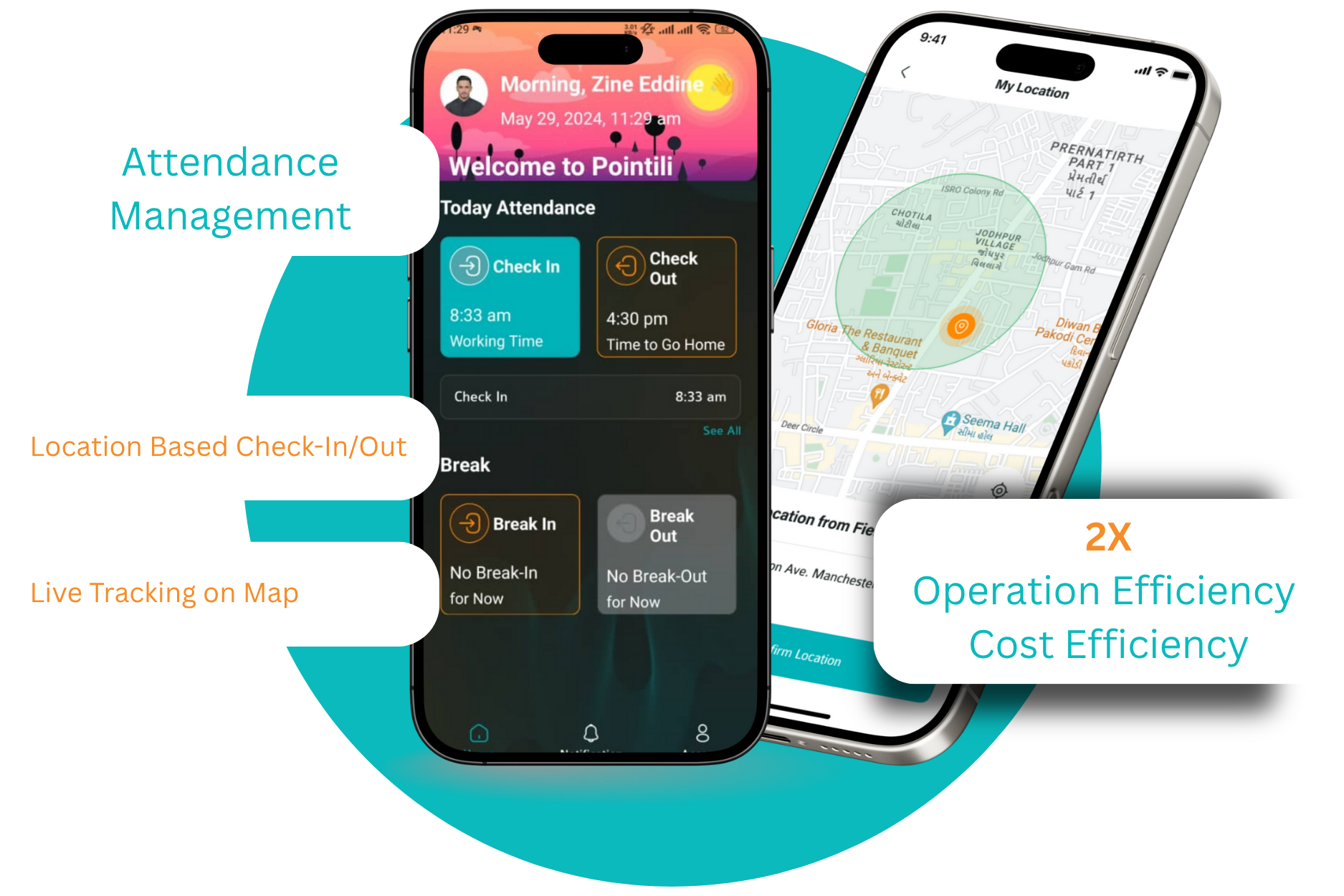 Les employés peuvent pointer en un seul clic, avec validation sécurisée par GPS et Face ID.