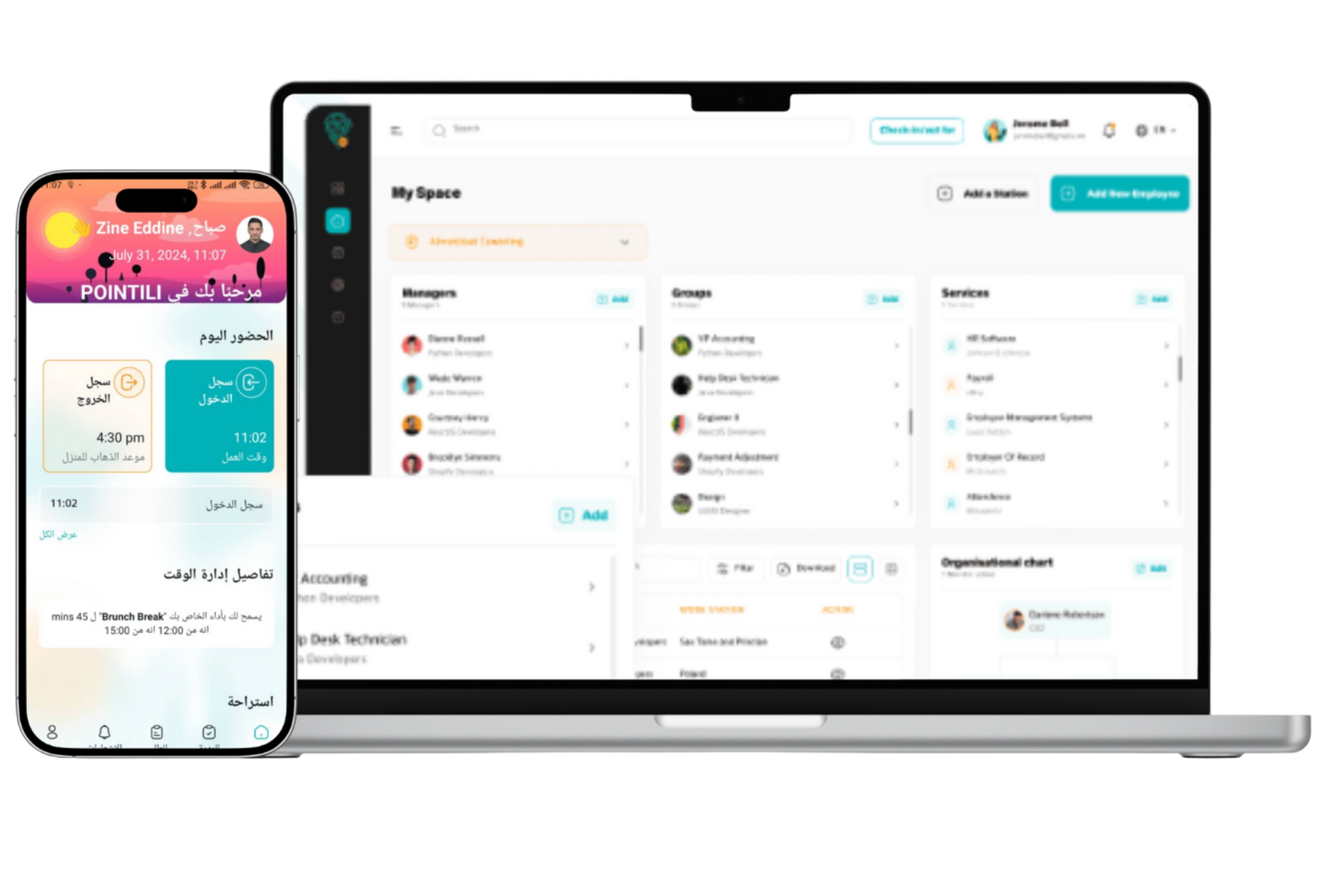 Learn MoreThe Pointili platform is designed for managers and HR teams to simplify workforce operations. Through a secure web dashboard, they can monitor attendance, manage employees, track missions, and process requests in real-time — all from one centralized interface.